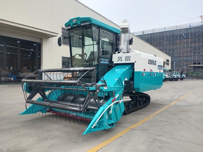 久富4LZ-7.0J型全喂入聯合收割機性能特點:動力強勁? 匹配130馬力國四發動機,動力強勁可靠,油耗低,省油,噪音小;通過性好 高底盤,濕爛田塊通過性好;防滑優,驅動強。高位液壓式卸糧裝置,省工高效。Performance characteristics of Jiufu 4LZ-7.0J full-feed combine harvester: strong power matching w